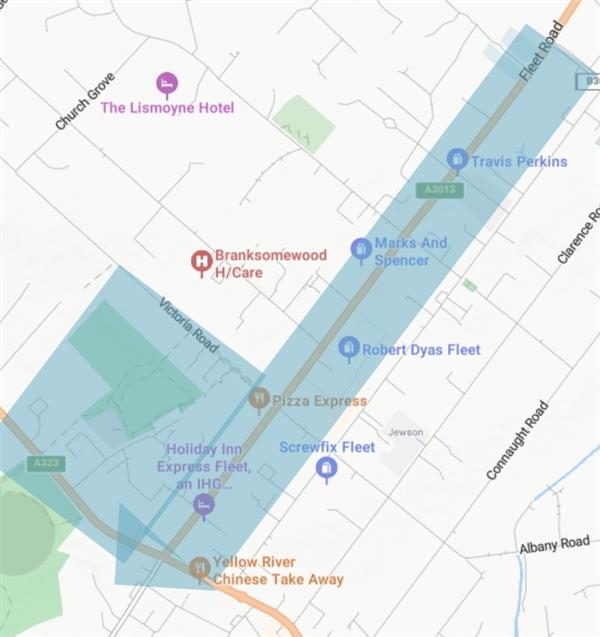The area covers Fleet Road from its junction with Kings Road in the north to Oatsheaf Crossroads in the south, across to Albert Street in the east.