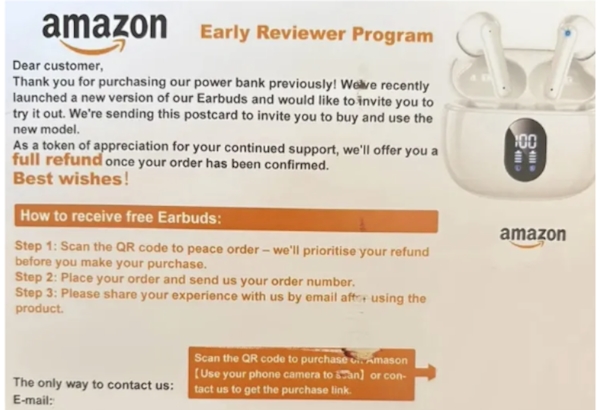 Good morning, Fraud is a very old crime type – and criminals use every technique, old and new, to defraud us. Which? are warning about this fake Amazon postcard which could drop through your letterbox offering free products in exchange for reviews with a “dodgy QR code” – all designed to harvest your personal and financial details and defraud you. Once upon a time, Amazon did run a genuine “Early Review Programme” but they stopped it in 2021.