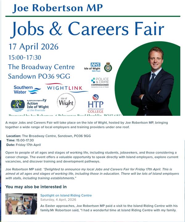 Jobs and Careers Fair will take place on the Isle of Wight, hosted by Joe Robertson MP |